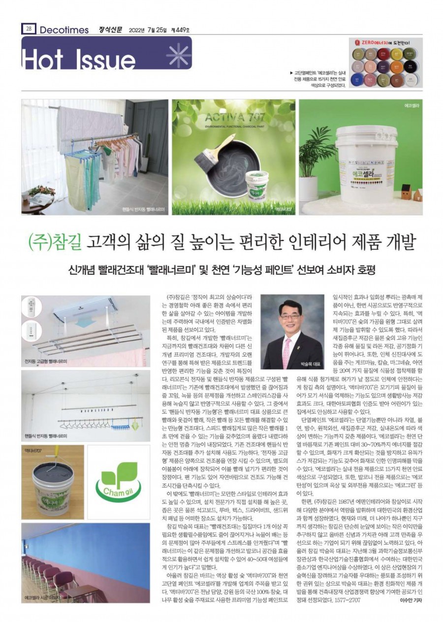 참길, 고객의 삶의 질 높이는 편리한 인테리어제품 개발 (장식신문 제449호) 페이지 정보 작성자 최고관리자 작성일22-07-20 15:39 조회31,792회 댓글0건 관련링크 본문 참길, 고객의 삶의 질 높이는 편리한 인테리어제품 개발 (장식신문 제449호) 댓글목록 등록된 댓글이 없습니다. 이전글 다음글 목록